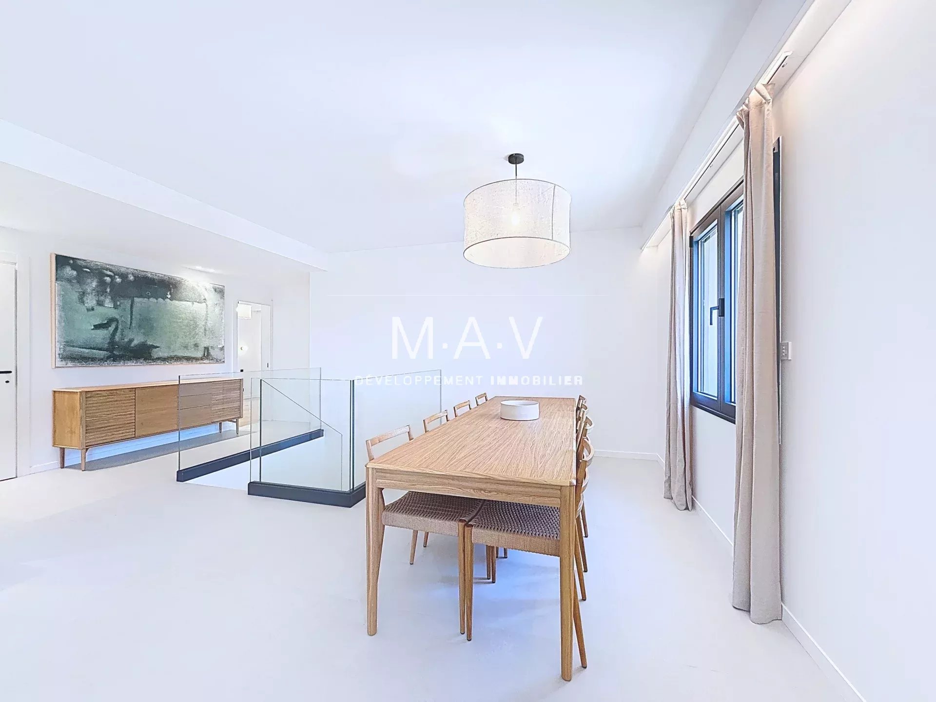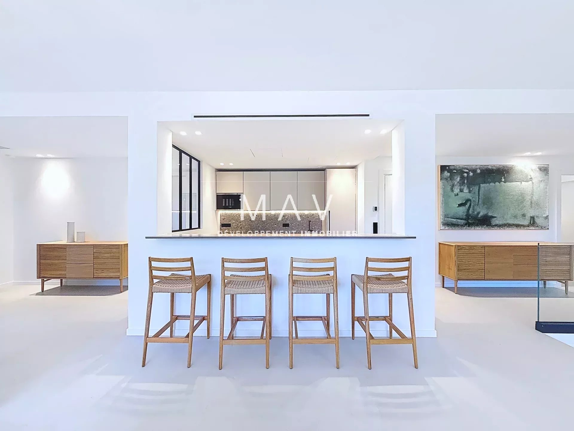 Completely renovated with high-end amenities, it stands out for its refined finishes: solid parquet floors, integrated reversible air conditioning, and bright spaces. The 62 m² living/dining room opens onto a fully equipped and fitted kitchen, enhanced by an elegant glass roof.